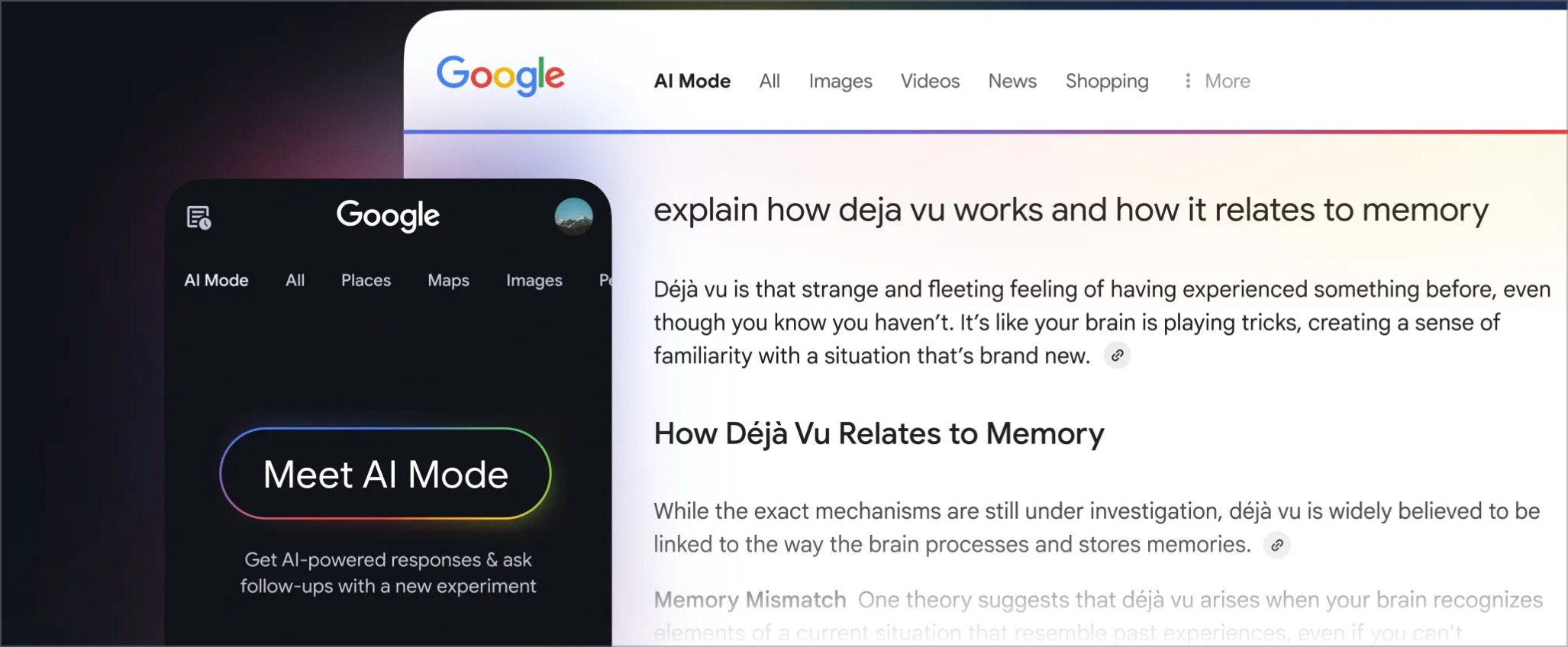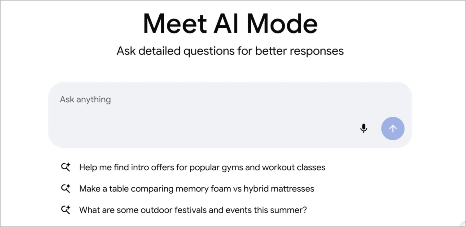 Han lanzado el AI Mode, un modo de búsqueda conversacional potenciado por IA que ya no solo muestra enlaces, sino resúmenes generados, contexto mantenido y contenido enriquecido: imágenes, vídeos, tarjetas de producto…