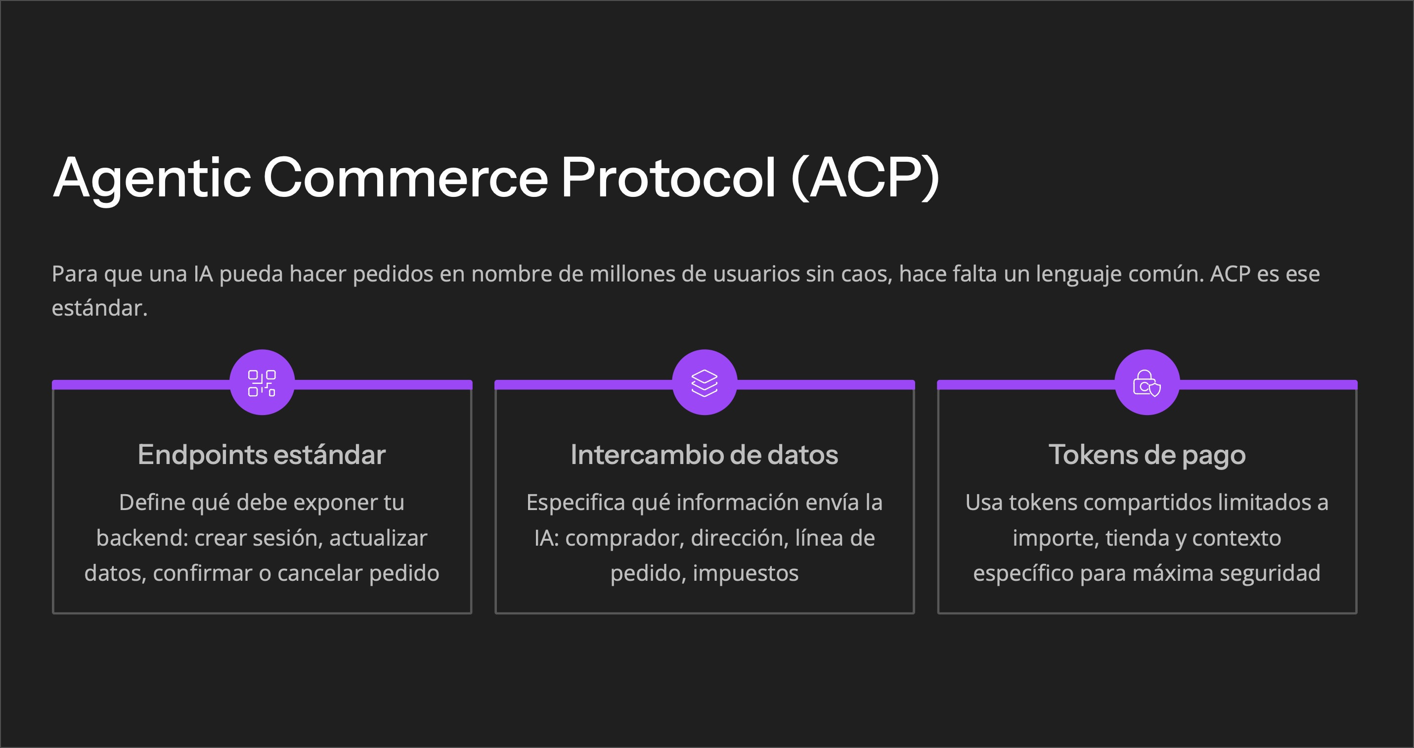 Agentic Commerce Protocol (ACP) → el estándar que permite que una IA hable con tu ecommerce y con tu pasarela de pago sin romper nada.