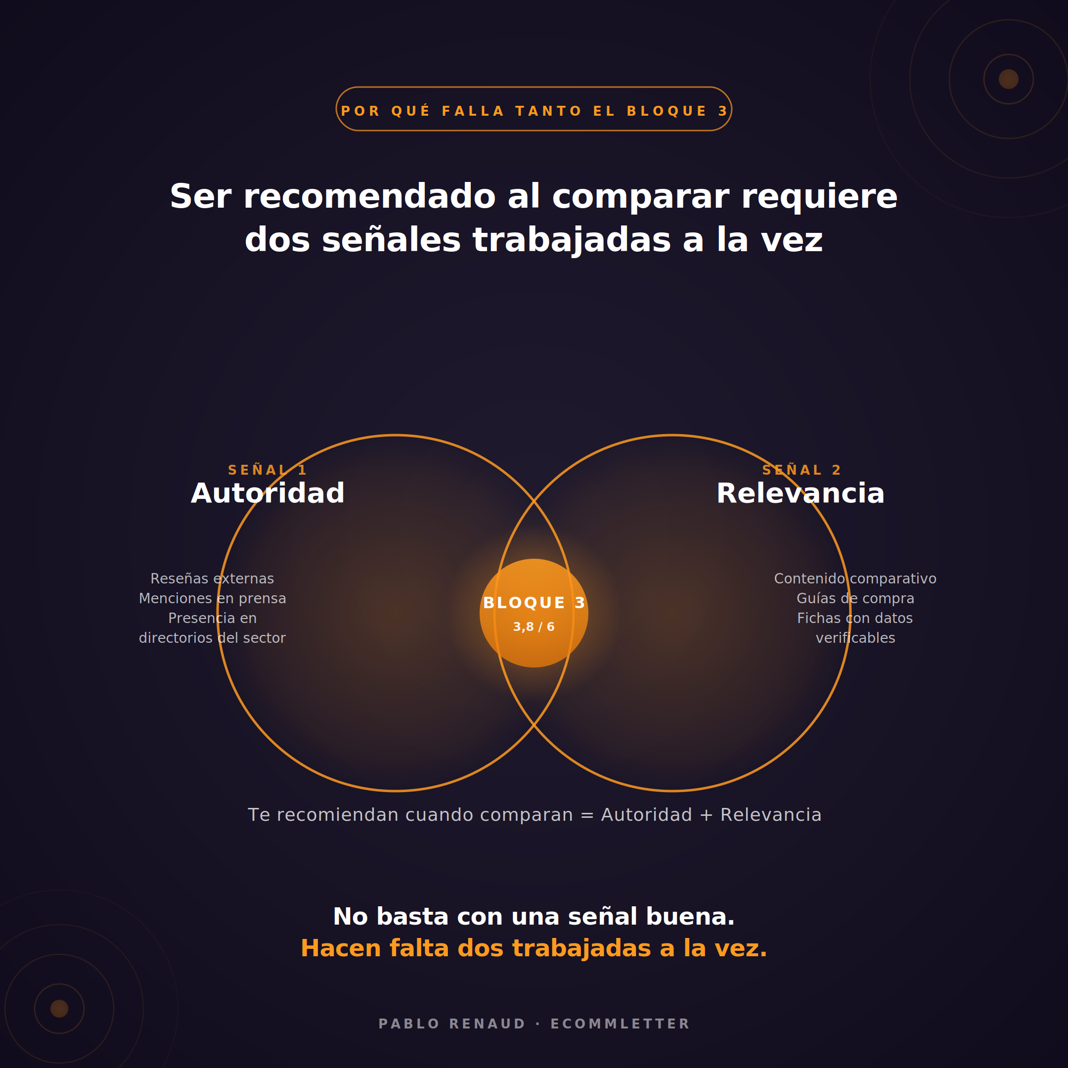 2️⃣ El segundo es relevancia: contenido en tu web que pueda compararse. Fichas de producto con datos específicos y verificables. Guías de compra que resuelvan las dudas típicas. Contenido comparativo propio sobre tu sector. Sin ese contenido, la IA no tiene materia para situarte en un ranking.
