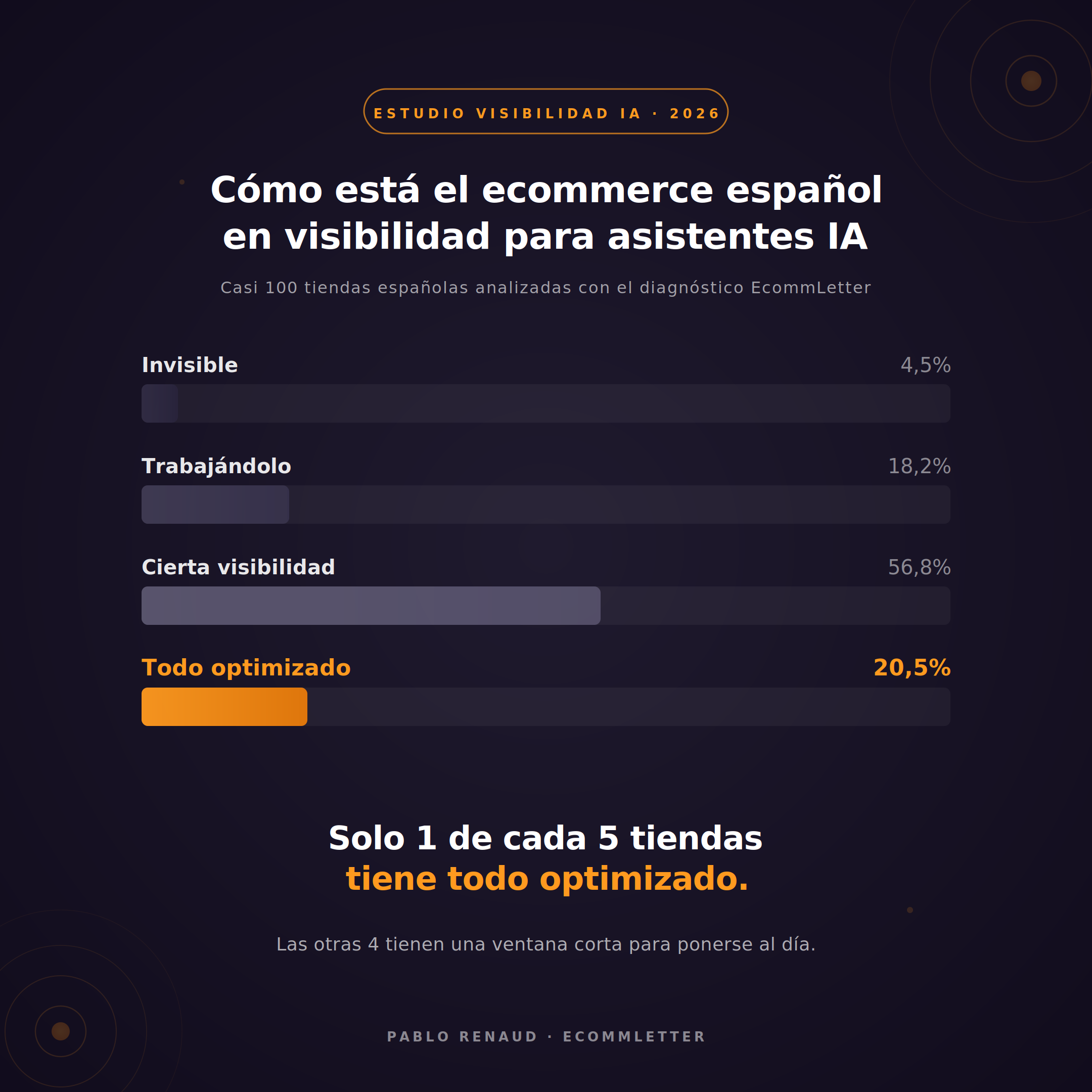 El 20,5% de las tiendas está ya en el nivel que llamo Todo optimizado: han trabajado las señales que los modelos de IA evalúan para decidir a quién citar y a quién no. Cuando alguien abre ChatGPT o Perplexity y pregunta dónde comprar productos de su categoría, tienen posibilidades reales de aparecer recomendadas.